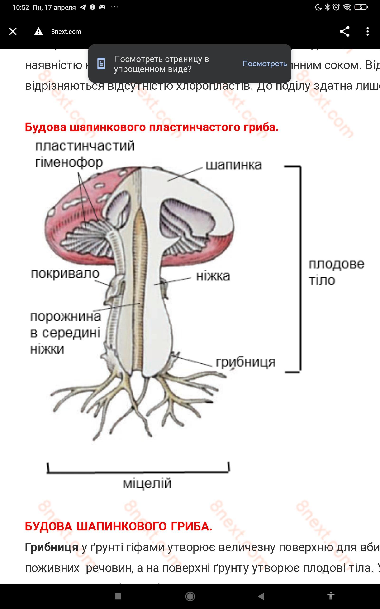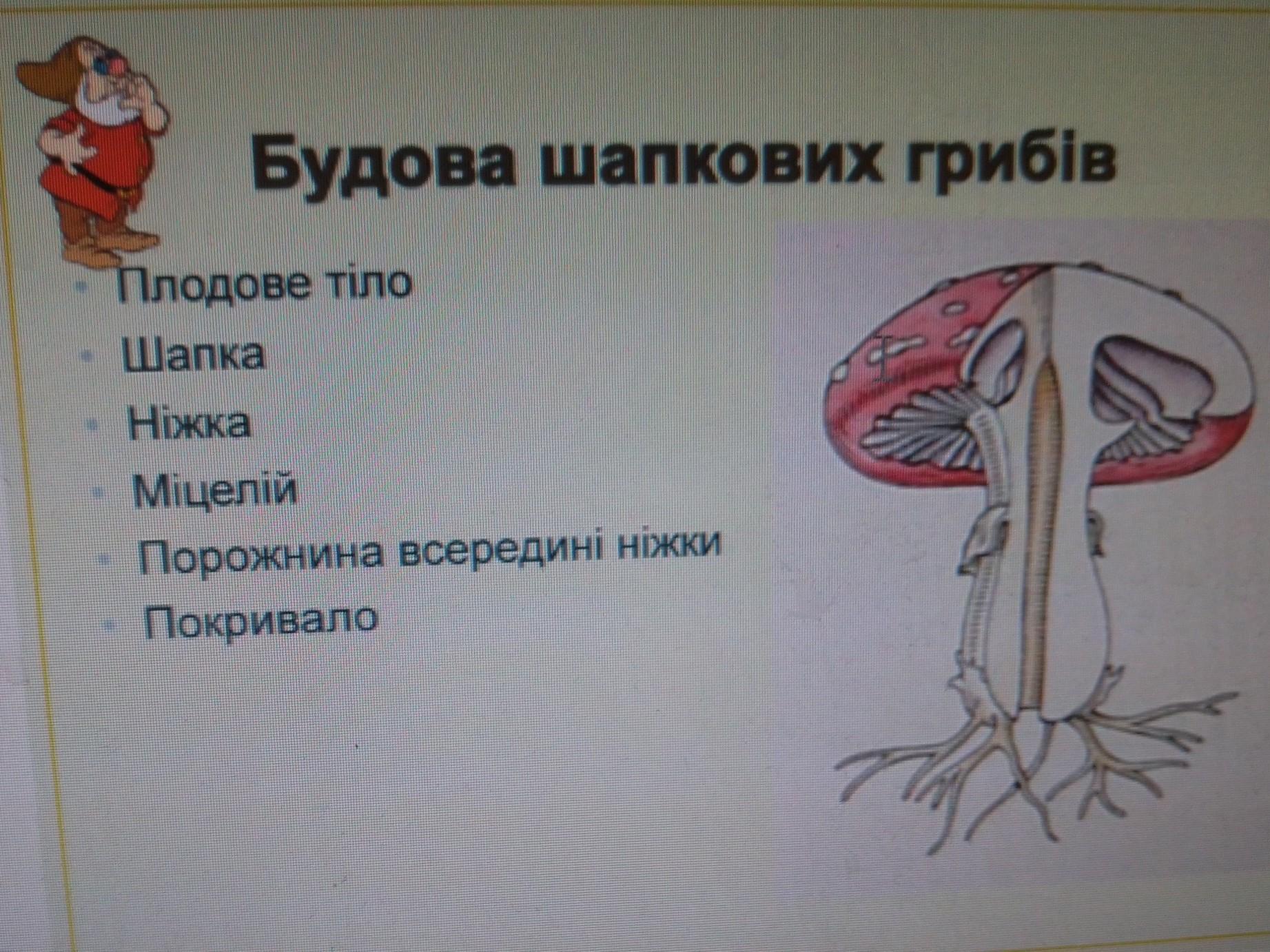 3. Замалюйте шапинковий гриб, позначивши на малюнку плодове тіло, шапинку, нiжку, грибницю (міцелій) Будова шапкових грибів Плодове тіло Шапка Нiжка Міцелій Порожнина всередині ніжки Покривало HACIAIO IN