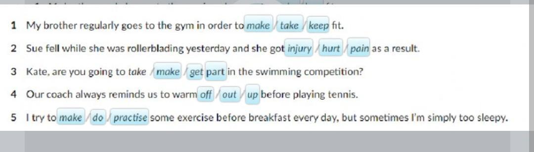 Ответ: 1) keep , 2) hurt , 3) part , 4) up , 5) do