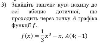 знайдіть тангенс кута нахилу до осі абсцис дотичної що проходить через точку А графіка функції f. f(x)= 1/3 x3-x, A(4;-1)