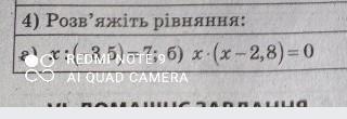 2)1Розв'язання даного рівняння можна отримати за допомогою правила добутку, за яким, якщо добуток двох чисел дорівнює нулю, то принаймні один з множників дорівнює нулю. Таким чином, у рівнянні x•(x-2,8)=0 одним з розв'язків є x=0. Щоб знайти інші розв'язки, потрібно розкрити дужки і перенести всі члени на одну сторону: