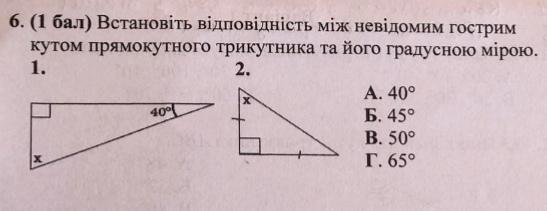 Встановіть відповідність між невідомим гострим кутом прямокутного трикутника та його градусною мірою.