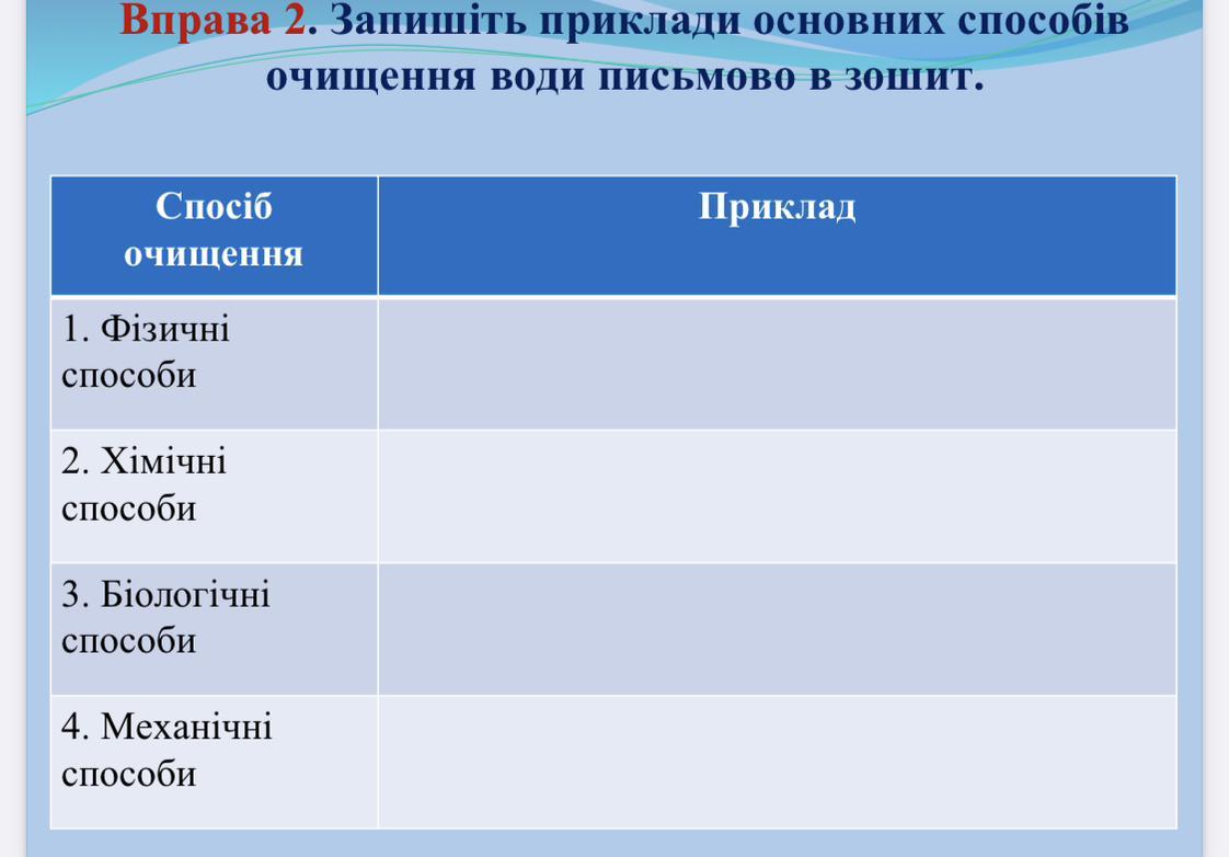 Задание номер 1:Наведіть приклади до кожного з видів забруднення.