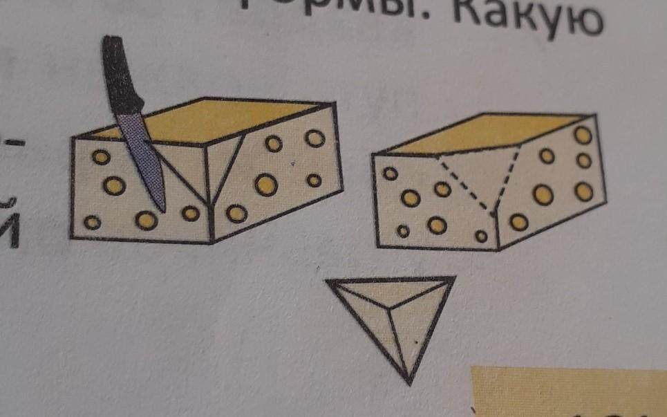 От сыра отрезали небольшой кусочек. Какую про- странственную фигуру он вам напоминает? Какой многоугольник в основании этой фигуры?