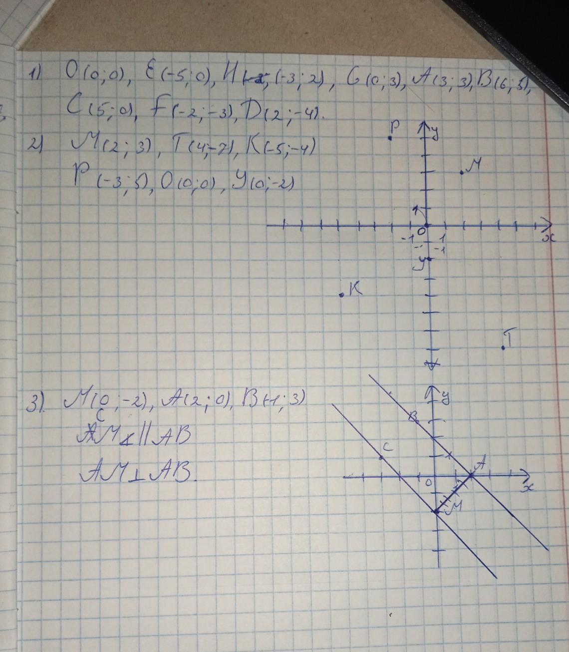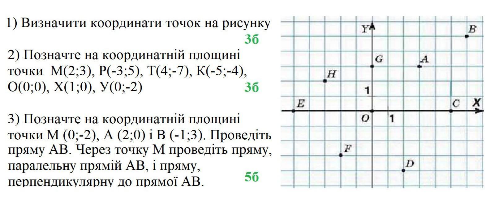 1) Визначити координати точок на рисунку 2) Позначте на координатній площині точки М(2;3), P(-3;5), T(4;-7), K(-5;-4), O(0;0), X(1;0), V(0;-2)