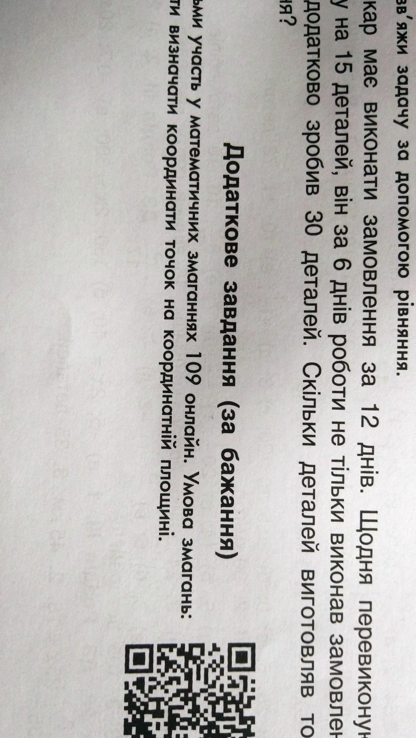 3. Розв'яжи задачу за допомогою рiвняння. Токар має виконати замовлення за 12 днів. Щодня перевиконуючи норму на 15 деталей, він за 6 днів роботи не тільки виконав замовлення, а й додатково зробив 30 деталей. Скільки деталей виготовляв токар щодня? Потрібно вийти 35 деталей