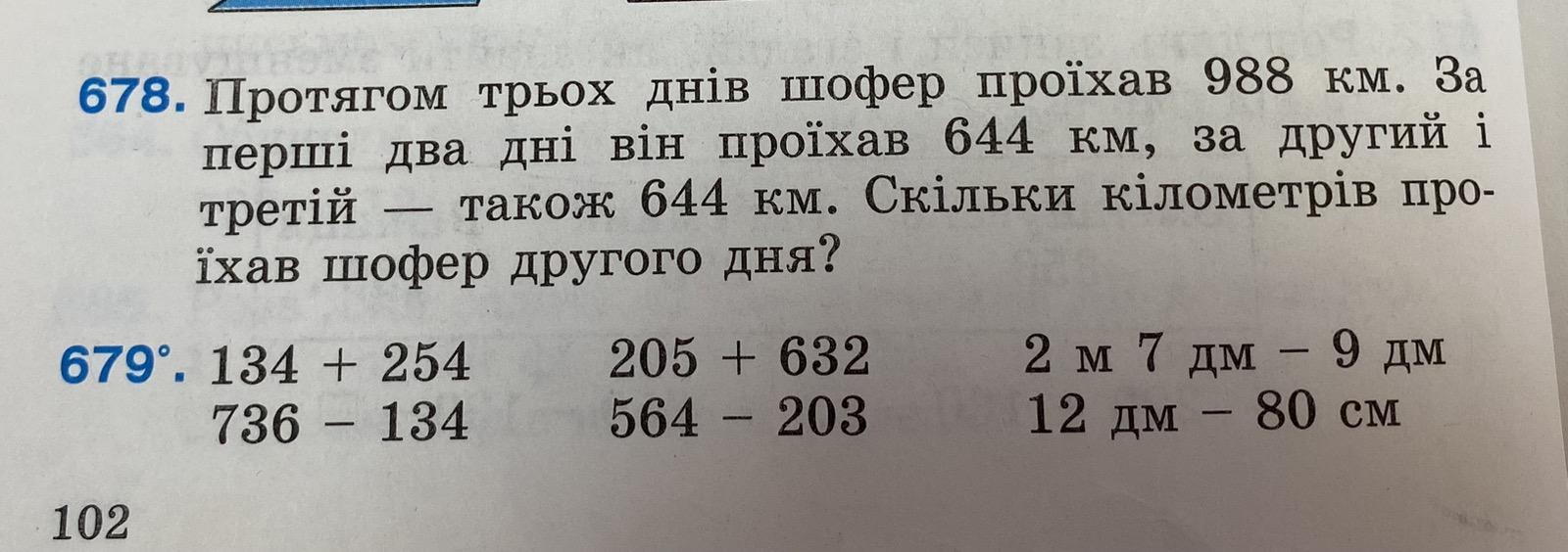 Відповідь: за другий день шофер проїхав 644км.