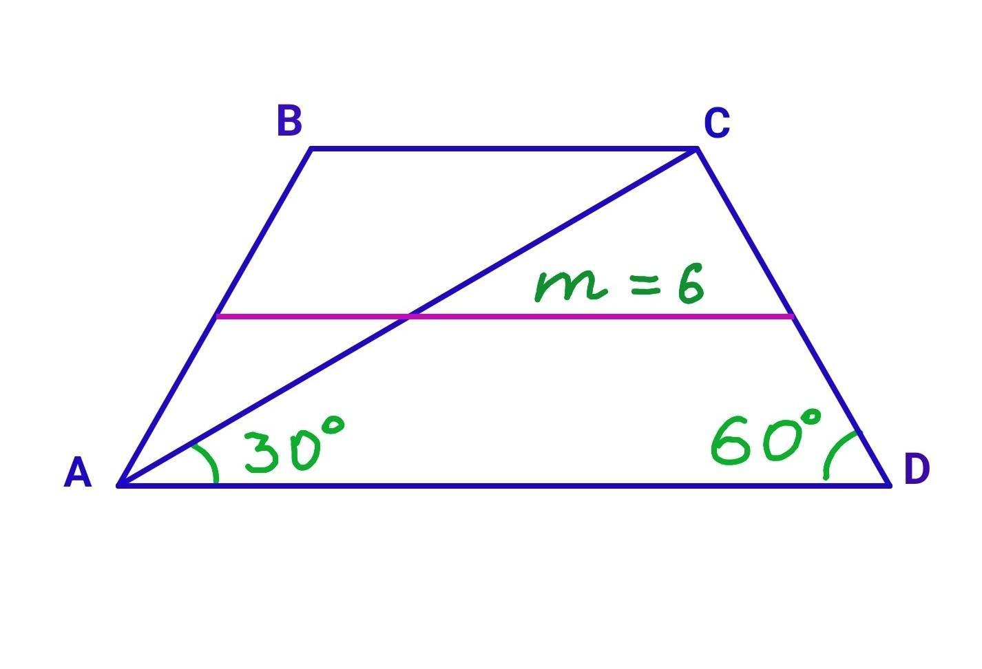 Средняя линия равнобедренный трапеции равна 6 см. Диагональ образуется с большим основанием угол 30°. Найти периметр этой трапеции если его острый угол 60°.