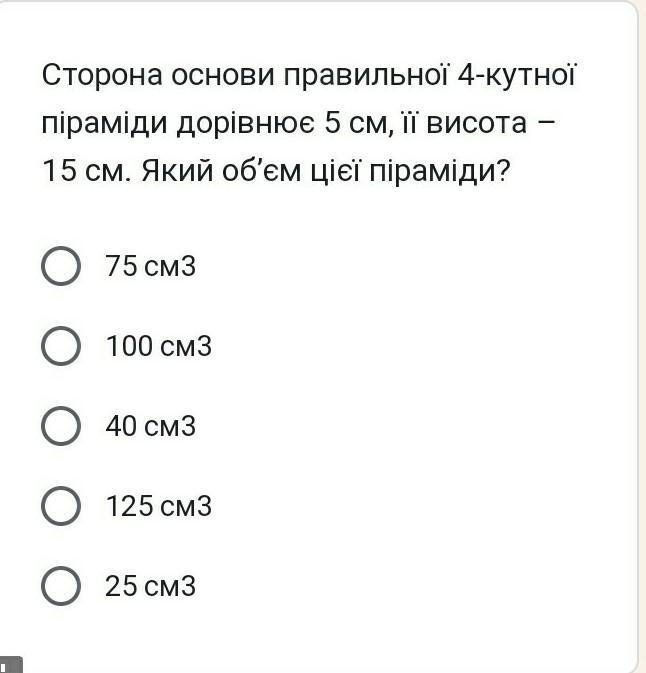 V=⅓*Sосн*h=⅓*25*15=125 см³