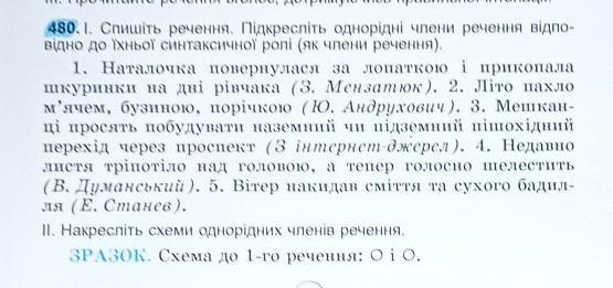 480. 1. Спишіть речення. Підкресліть однорідні члени речення відпо- відно до їхньої синтаксичної ролі (як члени речення). 1. Наталочка повернулася за лопаткою і прикопала шкуринки на дні рівчака (3. Мензатюк). 2. Літо пахло м'ячем, бузитною, порічкою (Ю. Андрухович). 3. Мешкан- ці просять побудувати наземний чи підземний пішохідний перехід через проспект (З інтернет-джерел). 4. Недавно листя тріпотіло над головою, а тепер голосно шелестить (В. Думанський). 5. Вітер накидав сміття та сухого бадил- ля (Е. Станев). II. Накресліть схеми однорідних членів речення. ЗРАЗОК. Схема до 1-го речення: 0 i 0.