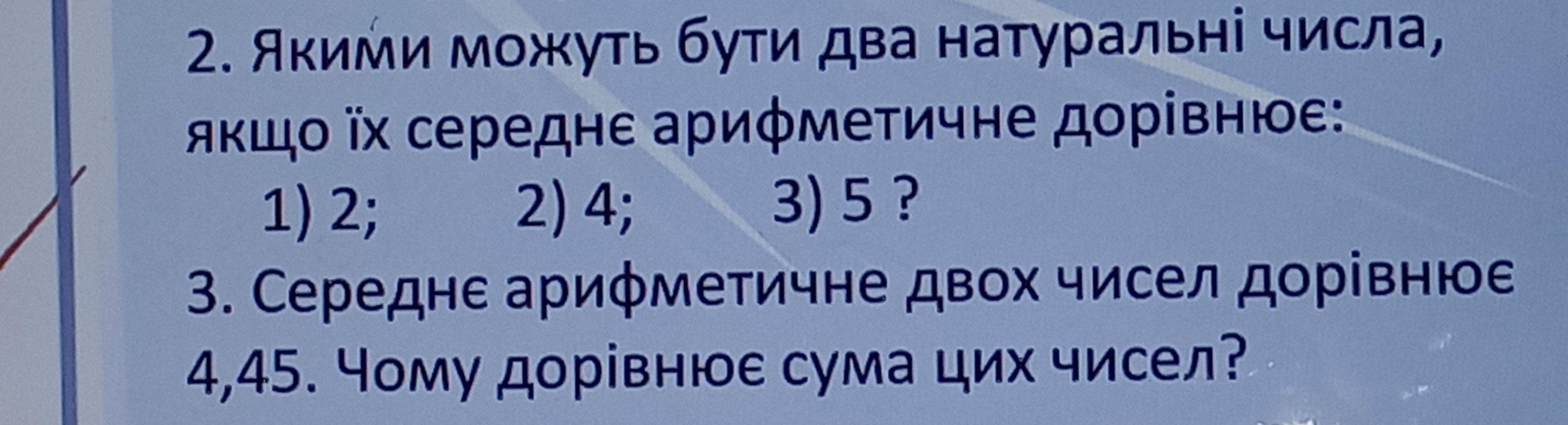 - Два натуральних числа, середнє арифметичне яких дорівнює 4, можуть бути лише 3 і 5.