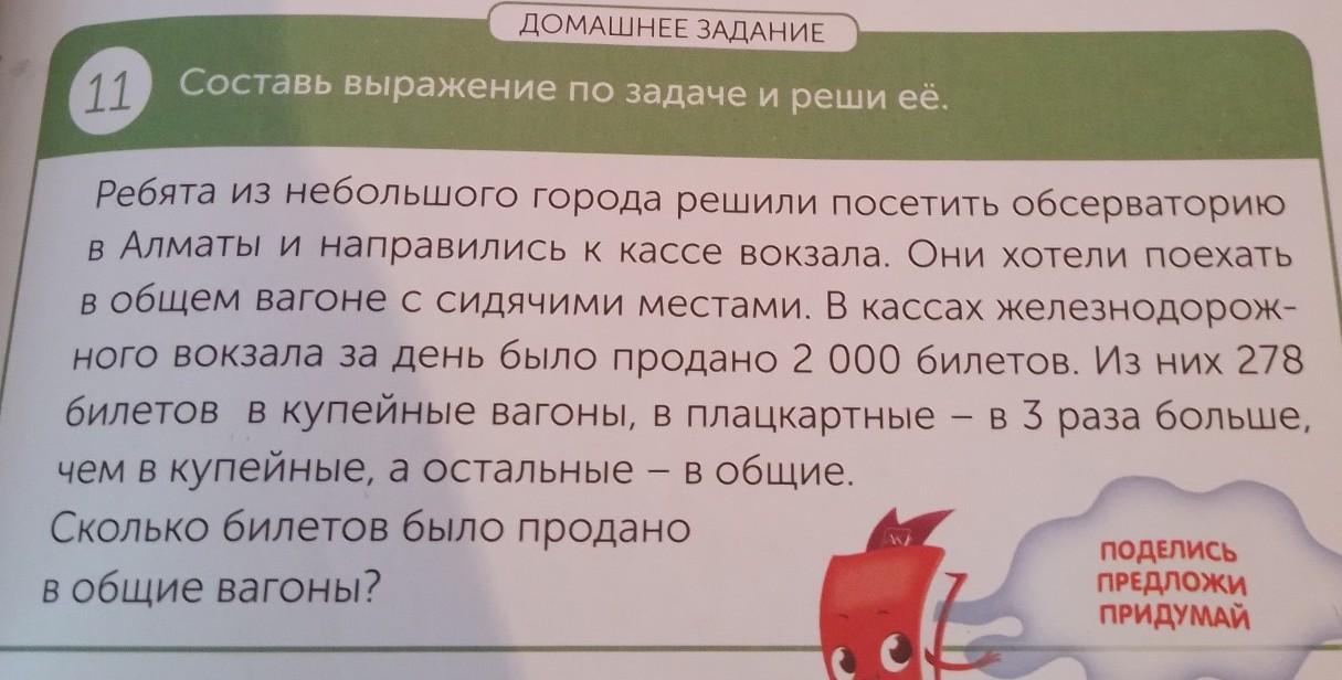 11 ДОМАШНЕЕ ЗАДАНИЕ Составь выражение по задаче и реши её. Ребята из небольшого города решили посетить обсерваторию в Алматы и направились к кассе вокзала. Они хотели поехать в общем вагоне с сидячими местами. В кассах железнодорож- ного вокзала за день было продано 2 000 билетов. Из них 278 билетов в купейные вагоны, в плацкартные - в 3 раза больше, чем в купейные, а остальные - в общие. Сколько билетов было продано в общие вагоны?