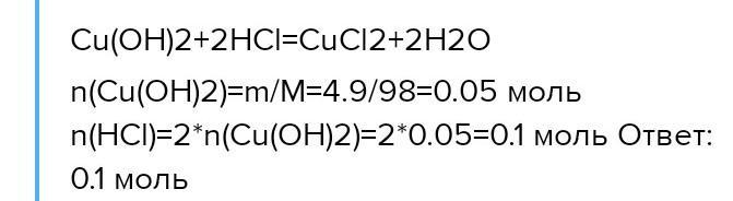 Cu(OH)2+2HCl=CuCl2+2H2O n(Cu(OH)2)=m/M=4.9/98=0.05 моль n(HCl)=2*n(Cu(OH)2)=2*0.05=0.1 моль Ответ: 0.1 моль
