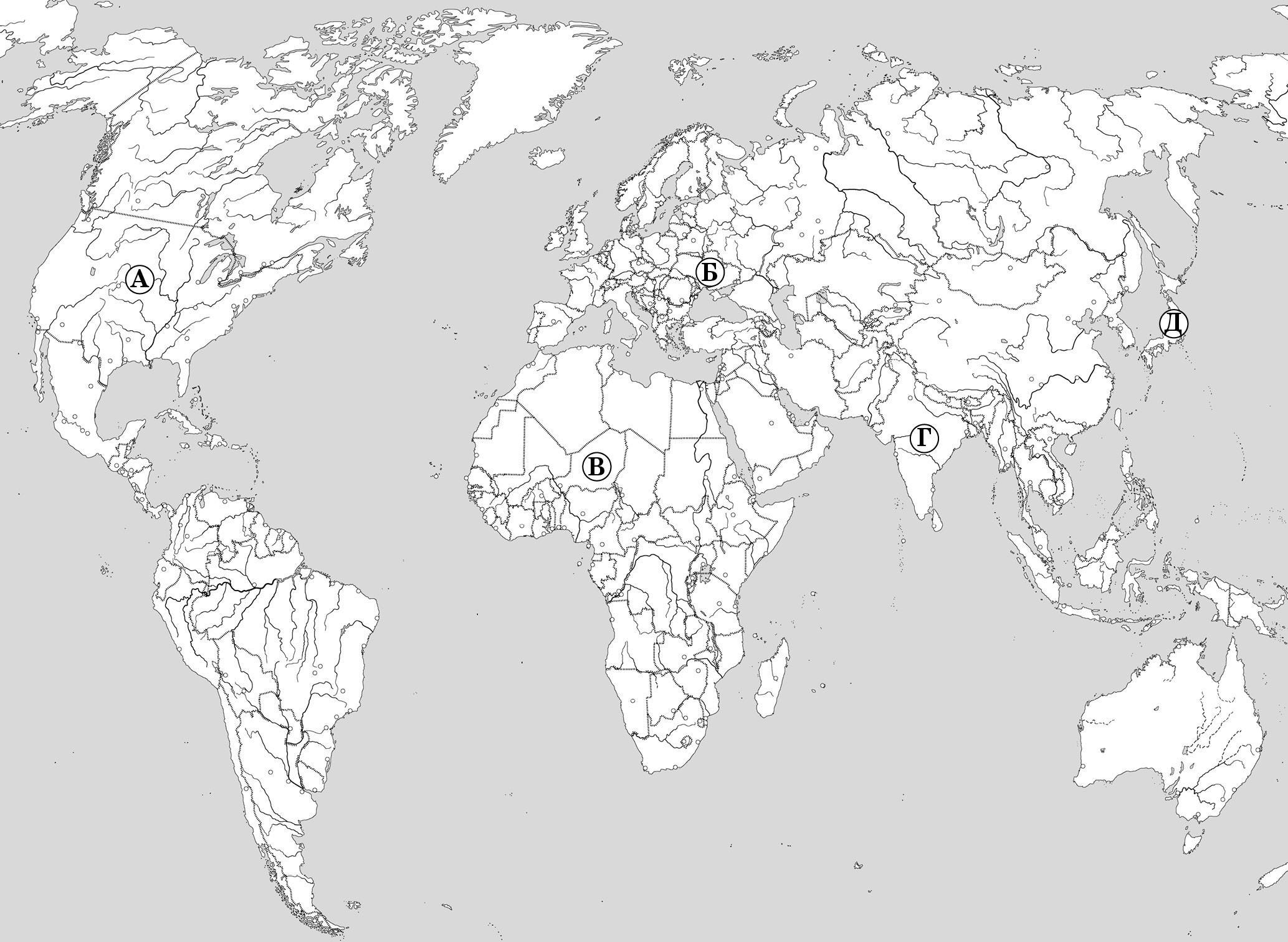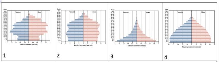 Установіть відповідність між статево-віковими пірамідами та країнами, позначеними на карто - схемі.