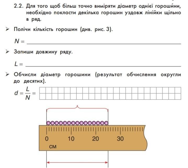 2.2. Для того щоб більш точно виміряти діаметр однієï горошини, необхідно покласти декілька горошин уздовж лінійки щільно в ряд. > Полічи кількість горошин (див. рис. 3). N = > Запиши довжину ряду. L= > Обчисли діаметр горошини (результат обчислення округли до десятих). L d = N = 0 CM 10 20 |||||| 30