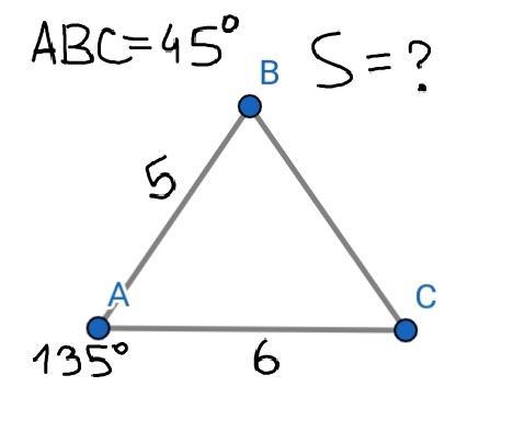 S = (1/2) * 6 * 5 * sin(135 * pi / 180) = 7.07 кв. см.