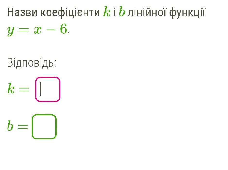 Назви коефіцієнти k i b лінійної функції y = x - 6. - Відповідь: k b - о