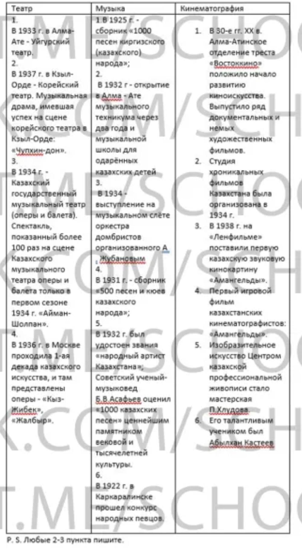 2. Заполните таблицу «Какие изменения произошли в искусстве в 20-30 годы ХХ века?» Приведите по два примера в каждом направлении искусства. Определите, какие изменения в искусстве отражают эти произведения. Укажите не менее трех изменений. 1) 2) Театр 1) 2) Музыка Изменения 1) 2) Кинематография