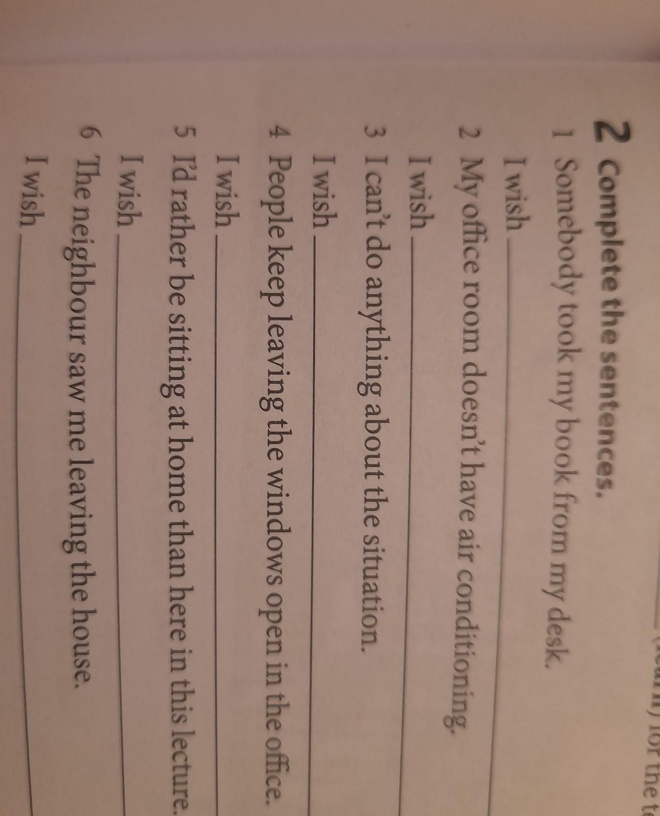 2 Complete the sentences. 1 Somebody took my book from my desk. I wish 2 My office room doesn't have air conditioning. I wish 3 I can't do anything about the situation. I wish 4 People keep leaving the windows open in the office. I wish 5 I'd rather be sitting at home than here in this lecture. I wish 6 The neighbour saw me leaving the house. I wish