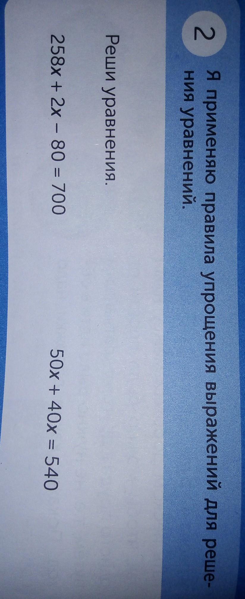 2 Я применяю правила упрощения выражений для реше- ния уравнений. Реши уравнения. 258x + 2x - 80 = 700 50x + 40 = 540 помогите, умоляю с проверкой