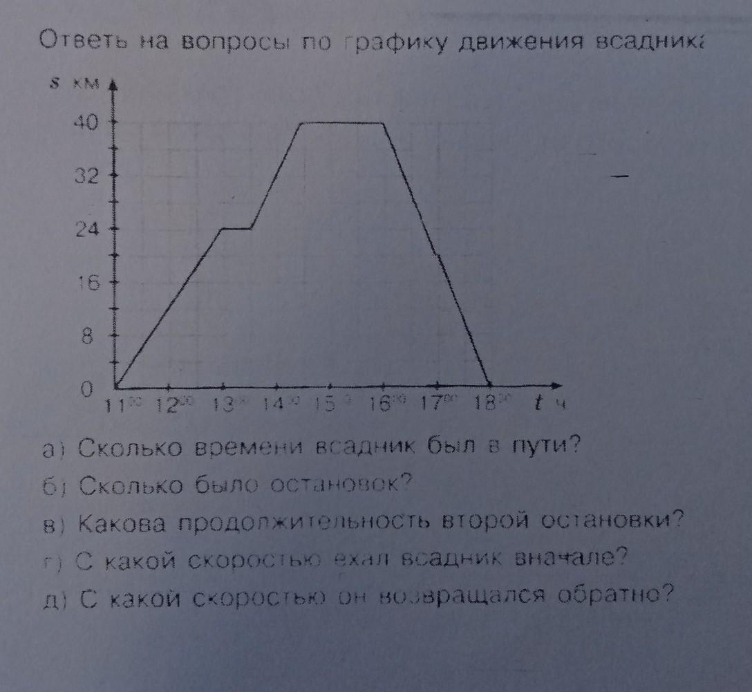 а) 7 часов, б) 2 , в) 1.5 часа, г) 12км/час, д) 20км/час
