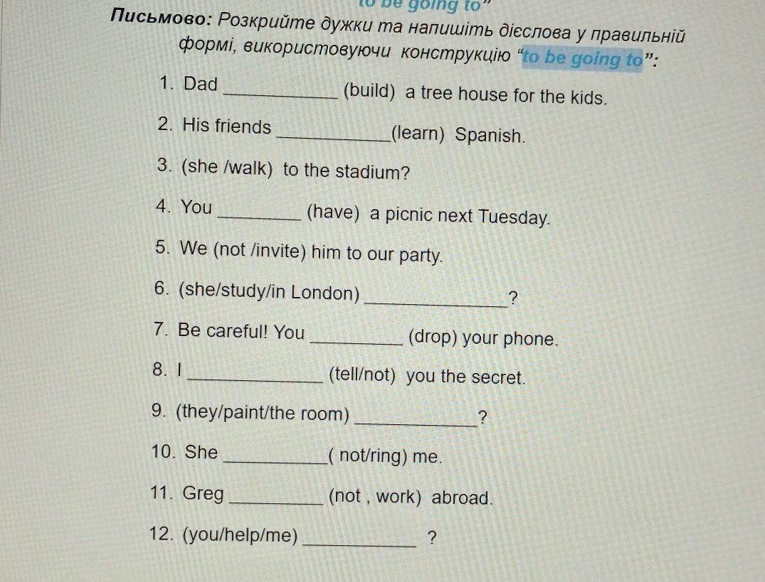 (+) Subject + am/is/are + going to + дієслово в форму інфінітиву без to/дієслово в першій формі.