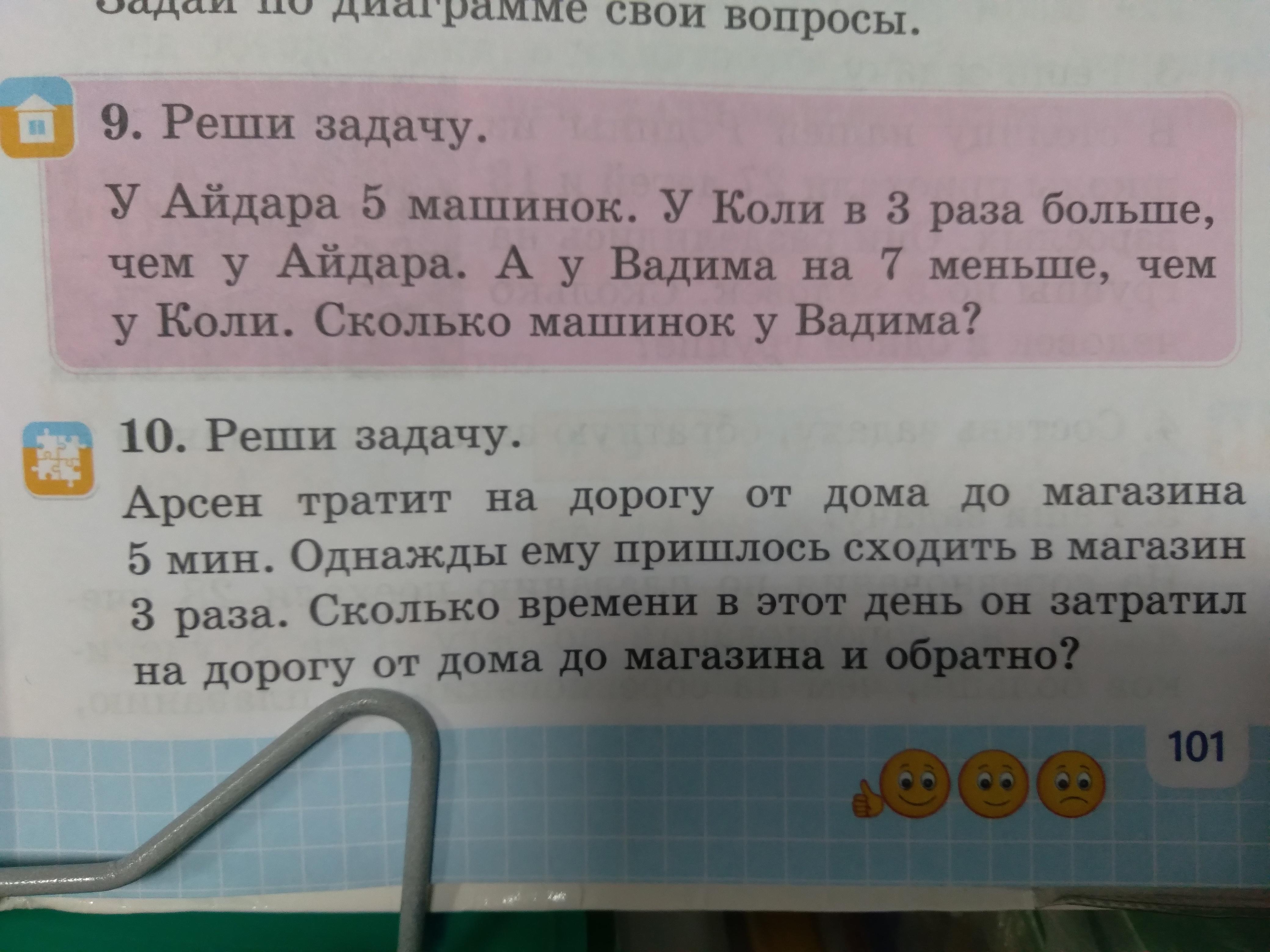 Реши задачу.У Айдара 5 машинок.У Коли в 3 раза больше,чем у Айдара.А у Вадима на 7 меньше,чем у Коли.Сколько машинок у Вадима?