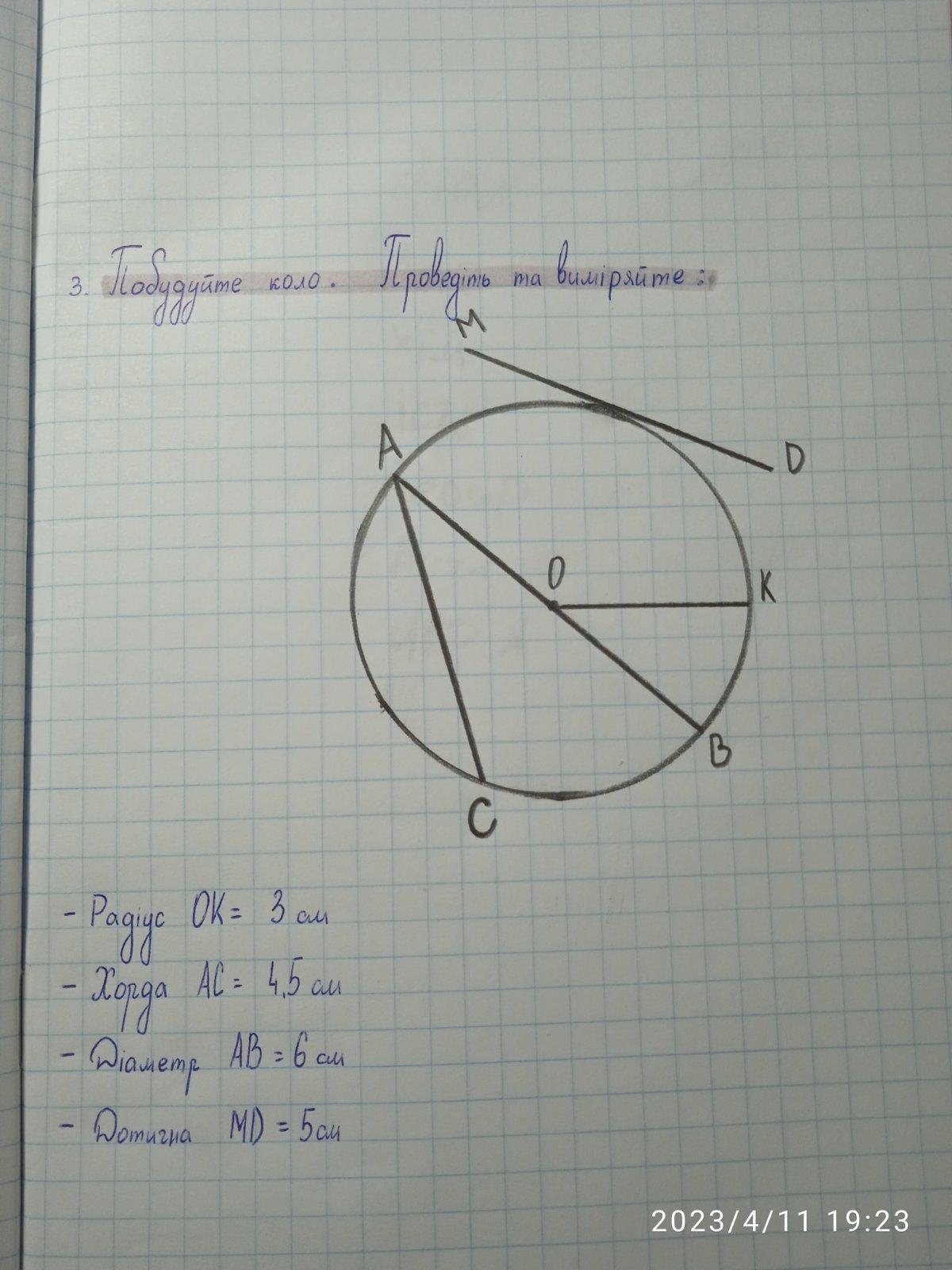 - діаметр АВ________ , -дотичну МД________