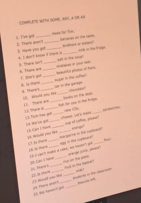 COMPLETE WITH SOME, ANY, A OR AN news for Tim. 1. I've got 2. There aren't 3. Have you got 4. I don't know if there is 5. There isn't 6. There are 7. She's got bananas on the table. brothers or sisters? 8. Is there 9. There's 10. Would you like 11. There are milk in the fridge. salt in the soup! mistakes in your test. beautiful photos of Paris. sugar in the coffee? car in the garage. chocolate? books on the desk. fish for you in the fridge. new CDs. 12. There is 13. Tom has got 14. We've got 15. Can I have 16. Would you like. orange? 17. Is there margarine in the cupboard? 18.Is there egg in the cupboard? 19.1 can't make a cake, we haven't got 20. Can I have 21. There's 22. Is there 23. Would you like 24. There aren't 25. We haven't got cheese. Let's make cup of coffee, please? orange juice, please? rice on the plate. fruit in the basket? milk? sandwiches. flour. students in the classroom. biscuits left.