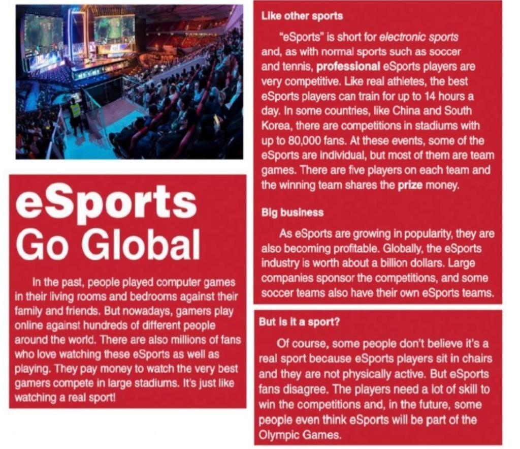 В минулому люди грали в комп'ютерні ігри в своїх вітальнях та спальнях проти своїх родичів та друзів. Але в наш час геймери грають онлайн проти сотень різних людей з усього світу. Є також мільйони фанатів, які люблять дивитись ці ігри. Вони платять гроші, щоб дивитись змагання між кращими гравцями на великих стадіонах. Це так само цікаво, як дивитись реальний спорт.