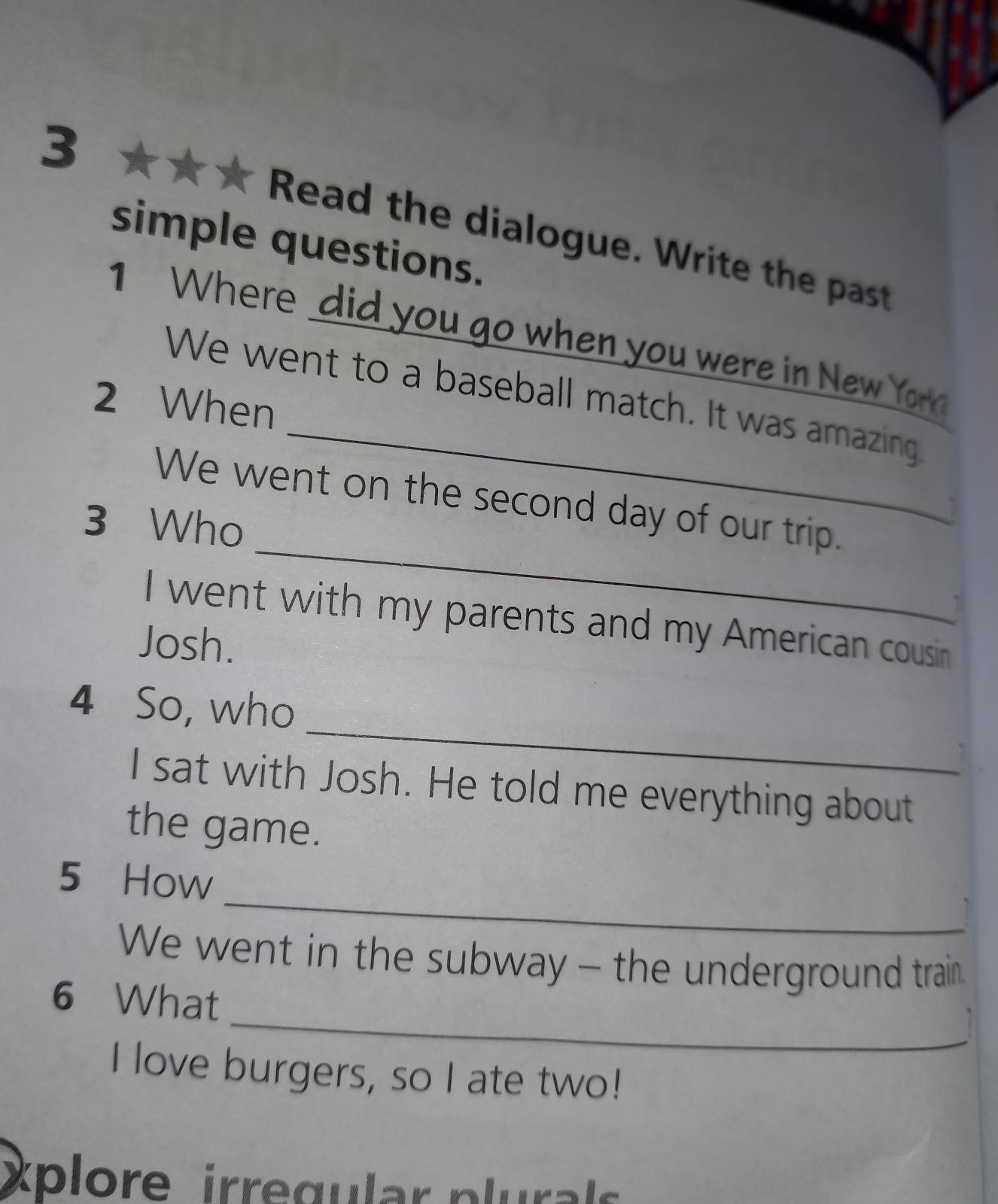 3*** Read the dialogue. Write the past simple questions. 1 Where did you go when you were in New York? We went to a baseball match. It was amazing. 2 When We went on the second day of our trip. 3 Who I went with my parents and my American cousin Josh. 4 So, who I sat with Josh. He told me everything about the game. 5 How We went in the subway - the underground train 6 What I эlove burgers, so I ate two