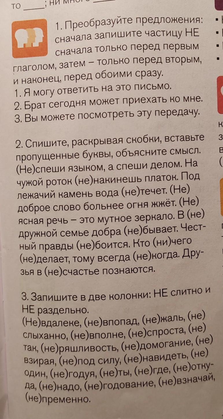 1. Преобразуйте предложения: сначала запишите частицу НЕ сначала только перед первым - только перед вторым, глаголом, затем сразу. - и наконец, перед обоими 1. Я могу ответить на это письмо. 2. Брат сегодня может приехать ко мне. 3. Вы можете посмотреть эту передачу. 2. Спишите, раскрывая скобки, вставьте пропущенные буквы, объясните смысл. (Не)спеши языком, а спеши делом. На (не)накинешь чужой роток платок. Под лежачий камень вода (не)течет. (He) доброе слово больнее огня жжёт. (Не) ясная речь дружной это мутное зеркало. В (не) семье добра (не)бывает. Чест- ный правды (не)боится. Кто (ни)чего (не)делает, тому всегда (не)когда. Дру- (не)счастье познаются. ЗЬЯ В 3. Запишите в две колонки: НЕ слитно и Не раздельно. (Не)вдалеке, (не)впопад, (не)жаль, (не) слыханно, (не)вполне, (не)спроста, (не) так, (не)ряшливость, (не)домогание, (не) взирая, (не)под силу, (не)навидеть, (не) один, (не)годуя, (не)ты, (не)где, (не)отку- да, (не)надо, (не)годование, (не)взначай, (не)пременно.
