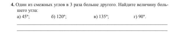 4. Один из смежных углов в 3 раза больше другого. Найдите величину боль- шего угла: a) 45°; 6) 120°; B) 135; г) 90°.