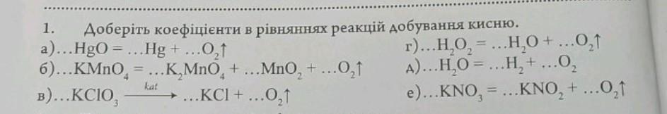 1. Доберіть коефіцієнти в рівняннях реакцій добування кисню. a)...HgO = ...Hg + ...O2 Б)...KMnO4 - ...K, MnO + ... ... ... . ...0,1 ...KCl + ...0, +. kat в)...KClO3 г)...H,O2 = ...H2O + ... 1 A)...H,O = ...H2 + ...0, e)...KNO2 = ...KNO2 + ...O2↑