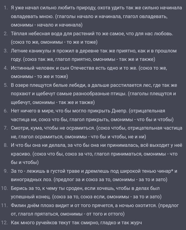 1. Я уже нач..нал сильно любить природу, охота удить так (же) сильно нач..нала овл..девать мною. (С. Аксаков) 2. Тёплая небесная вода для р..стений то (же) самое, что для нас любовь. (М. Пришвин) 3. Летние к..никулы я прожил в деревне так (же) пр..ятно, как и в прошлом году. (С. Аксаков) 4. Исти..ый человек и сын Отечества есть одно и то (же). (Н. Радищев) 5. В озере плещ..тся белые лебеди, а дальше ра..ст..лается лес, где так (же) порхают и щебеч..т самые разнообразные птицы. (М. Рид) 6. Нет (н..) чего в мире, что (бы) могло пр..крыть Днепр. (Н. Гоголь) 7. Смотри, кума, что (бы) (не) осрамиться. (И. Крылов) 8. И что (бы) она ни делала, за что (бы) она ни пр..н...малась, всё выходит у неё красиво. (И. Тургенев) 9. За (то) - лежишь в густой траве и дремлешь под широкой тенью чинар* и виноградных лоз. (М. Лермонтов) 10. Берись за (то), к чему ты сроден, коль хоч..шь, что (б) в делах успешный был конец. (И. Крылов) 11. Филин днём плохо вид..т и от (того) пряч..тся, а ночью охот..тся. (М. Пришвин) 12. Как много ручейков текут так смирно, гладко и так журчат для сердца сладко лишь только ОТ (ТОГО), что мало в них воды! (И. Крылов)