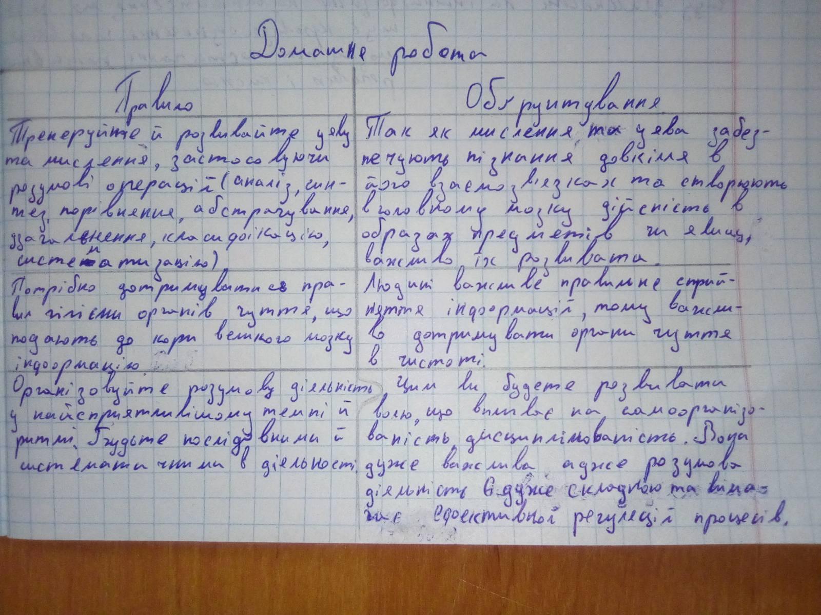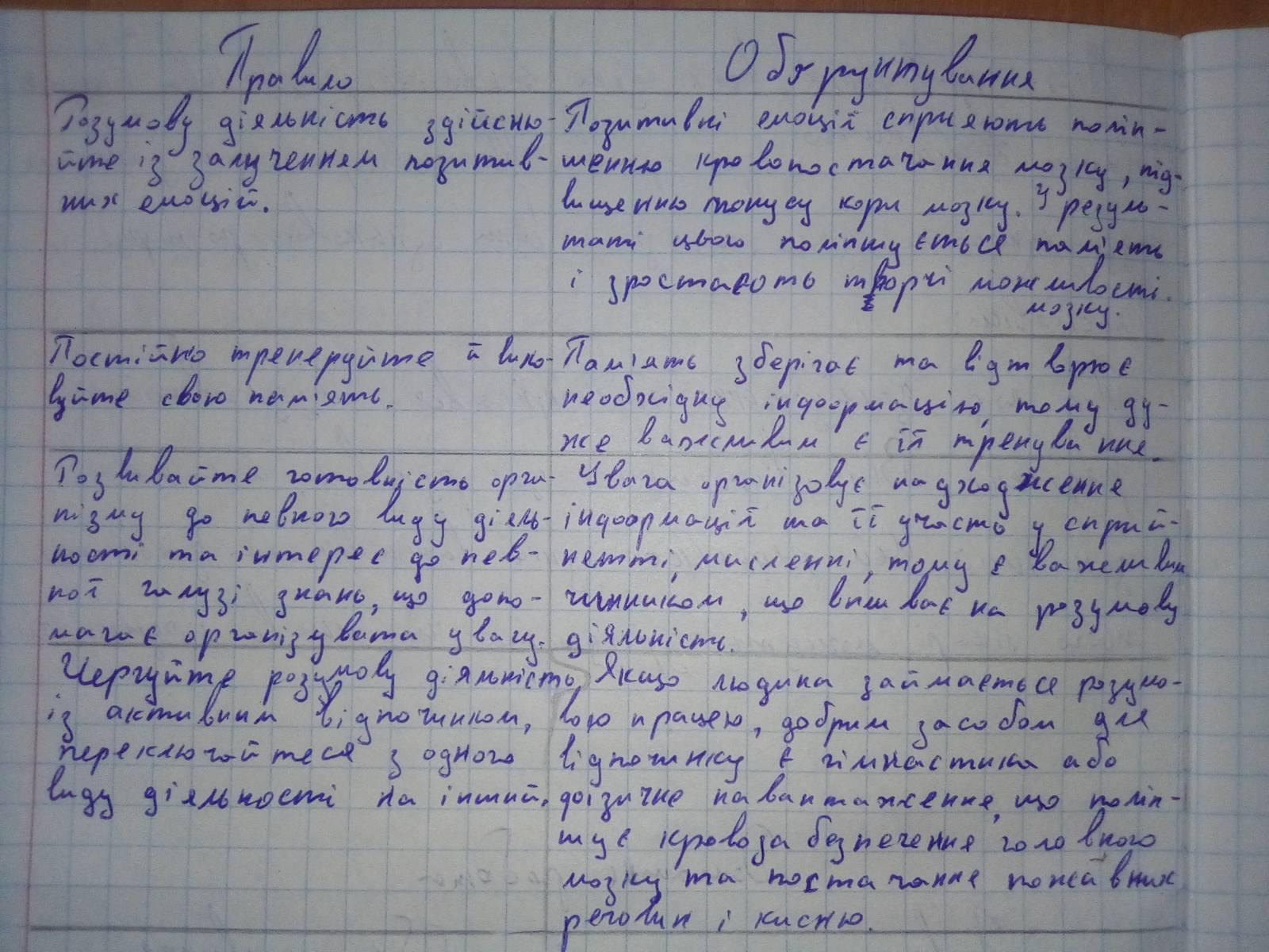 ОСНОВНІ ПРАВИЛА РОЗВИТКУ РОЗУМОВОЇ ДІЯЛЬНОСТІ Правило Тренуйте й розвивайте уяву та мислення, застосовуючи розумові опе- рації (аналіз, синтез, порівняння, абстрагування, узагальнення, класи- фiкацiю, систематизацію) Потрібно дотримуватись правил гігієни органів чуття, що подають до кори великого мозку інформацію. Особливо це стосується очей, які потребують періодичних вправ Організовуйте розумову діяльність у найсприятливішому темпі й рит- мі. Будьте послідовними й систематичними в діяльності Розумову діяльність здійснюйте із залученням позитивних емоцій Постійно тренуйте й виховуйте свою пам'ять й Розвивайте готовність організму до певного виду діяльності та iнте- рес до певної галузі знань, що допомагає організовувати увагу. Тре- нуйте такі властивості уваги, як концетрація, стійкість, переключення ТОЩО Чергуйте розумову діяльність із активним відпочинком, переключай- теся з одного виду діяльності на інший Обґрунтування.