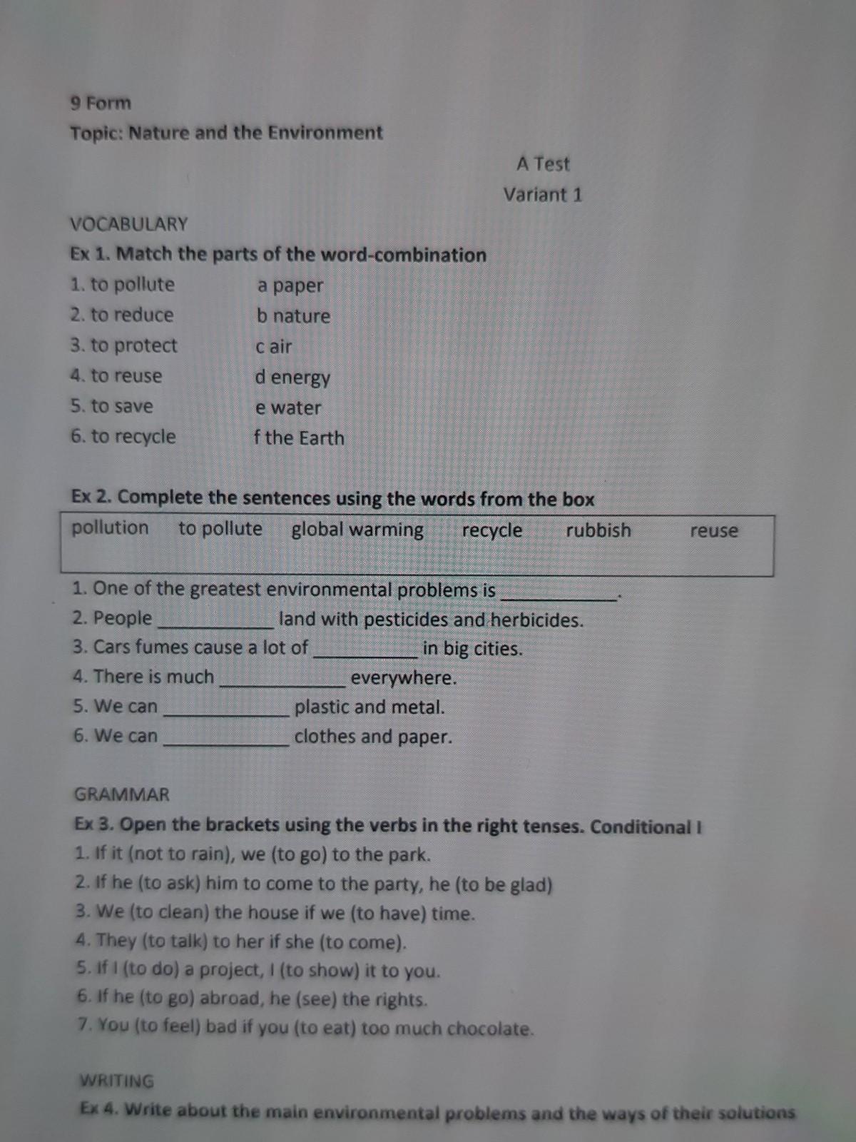 9 Form Topic: Nature and the Environment VOCABULARY Ex 1. Match the parts of the word-combination 1. to pollute 2. to reduce 3. to protect 4. to reuse 5. to save 6. to recycle a paper b nature cair d energy e water f the Earth Ex 2. Complete the sentences using the words from the box pollution to pollute global warming recycle rubbish 1. One of the greatest environmental problems is 2. People 3. Cars fumes cause a lot of 4. There is much 5. We can 6. We can A Test Variant 1 land with pesticides and herbicides. in big cities. everywhere. plastic and metal. clothes and paper. reuse GRAMMAR Ex 3. Open the brackets using the verbs in the right tenses. Conditional I 1. If it (not to rain), we (to go) to the park. 2. If he (to ask) him to come to the party, he (to be glad) 3. We (to clean) the house if we (to have) time. 4. They (to talk) to her if she (to come). 5. If I (to do) a project, I (to show) it to you. 6. If he (to go) abroad, he (see) the rights. 7. You (to feel) bad if you (to eat) too much chocolate. WRITING Ex 4. Write about the main environmental problems and the ways of their solutions