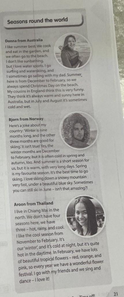 6 Read the texts again and put the verbs in the correct positive or negative. 1 Donna doesn't come (come) from England. She often .(go) to the beach. She (like) sunbathing. 2 Aroon and dancing. 3 Bjorn (come) from the south of Thailand. She (love) singing (come) from the north. She (like) winter best. He (like) spring.