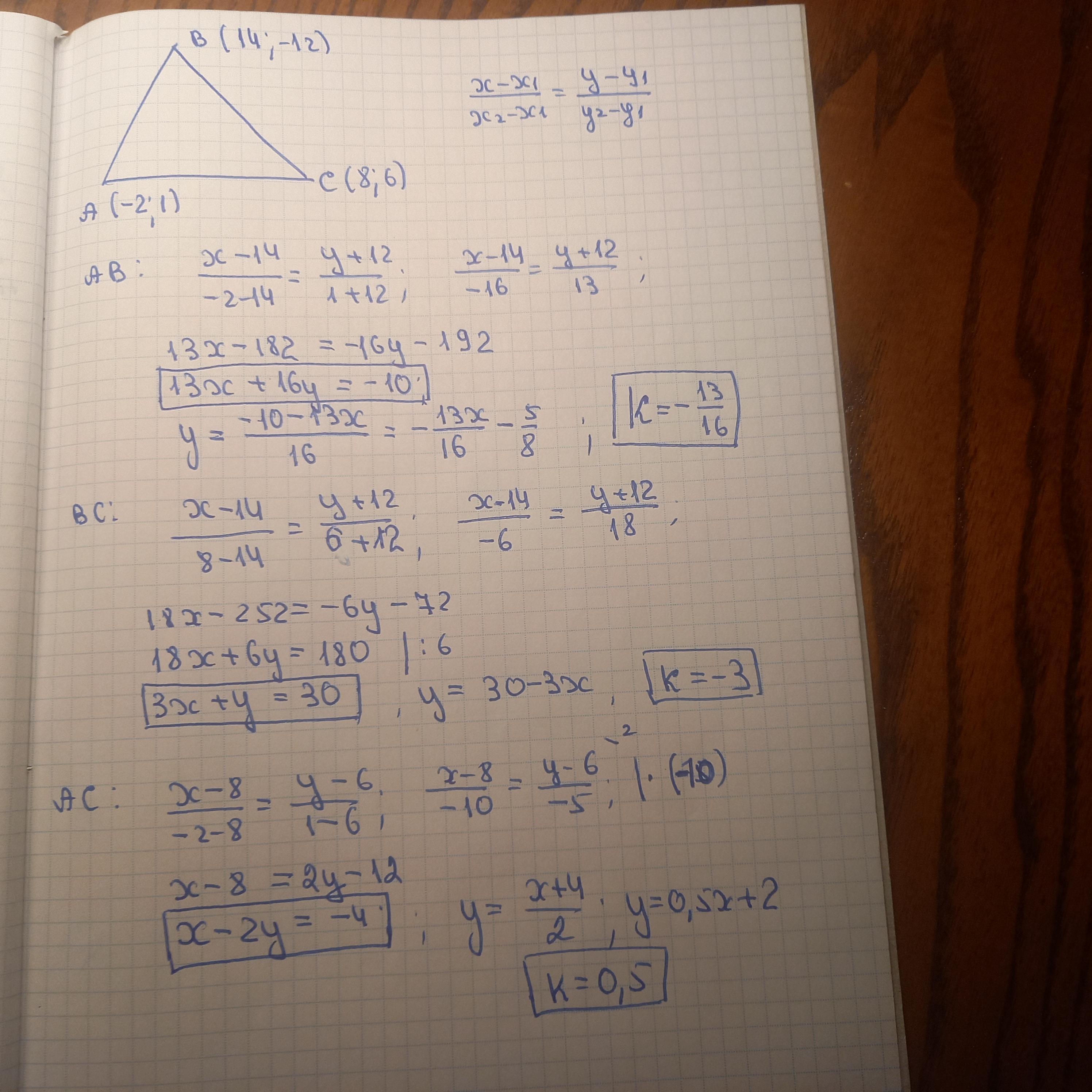 Задано координати вершин трикутника АВС. A (-2; 1), B (14; -12), C (8; 6) Знайти: