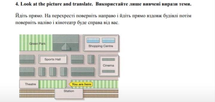 Відповідь: Go straight. At the crossing, turn right and walk straight along the building, then turn left and the cinema will be to your right