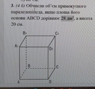 3. (4 б) Обчисли об'єм прямокутного паралелепіпеда, якщо площа його основи ABCD дорівнює 28 дм², а висота 20 см. A₁ B₁ В D₁ C₁ C. СРОЧНО!!!! ДАМ 40 БАЛЛОВ!!