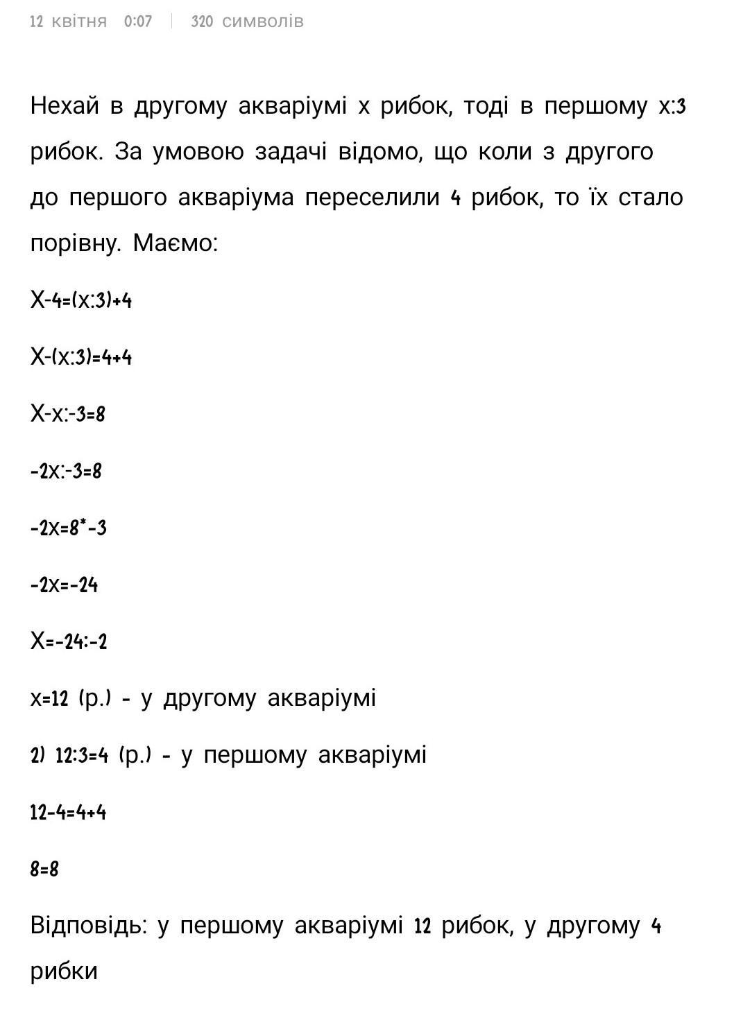 В першому акваріумі у 3 рази менше рибок, ніж у другому. Якщо з другого акваріуму переселити чотирьох рибок в перший акваріум, то в обох акваріумах буде порівну рибок. Скільки рибок в кожному акваріумі?