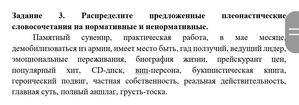 Задание 3. Распределите предложенные на нормативные и ненормативные. плеонастические словосочетания Памятный сувенир, практическая работа, B мае месяце демобилизоваться из армии, имеет место быть, гад ползучий, ведущий лидер, эмоциональные переживания, биография жизни, прейскурант цен, популярный хит, CD-диск, вип-персона, букинистическая книга, героический подвиг, частная собственность, реальная действительность, главная суть, полный аншлаг, грусть-тоска.