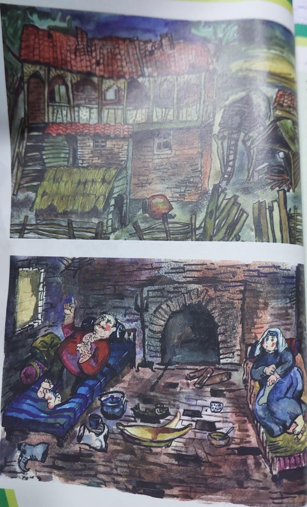 Посмотрите на иллюстрации на следующей странице, которые художник создал по рассказу Ильи Чавчавадзе. На первой иллюстрации изображен дом самого Луарсаба М. Таткаридзе. Что бы вы сказали об этом хозяине? Он На следующей иллюстрации представлены герои рассказа Луарсаб и его жена Пицеби Дареджани. Опишите этих персонажей по картинке. Представьте, о чем они могут говорить.