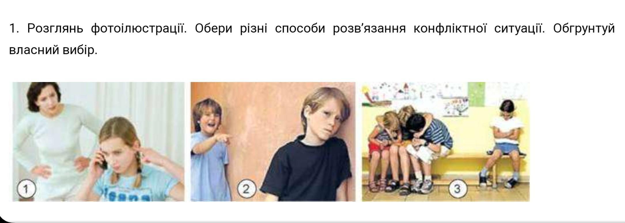 ДУЖЕ ТРЕБА, 7 КЛАС ОСНОВИ ЗДОРОВ’Я Розглянь фотоілюстрації. Обери різні способи розв'язання конфліктної ситуації. Обгрунтуй власний вибір