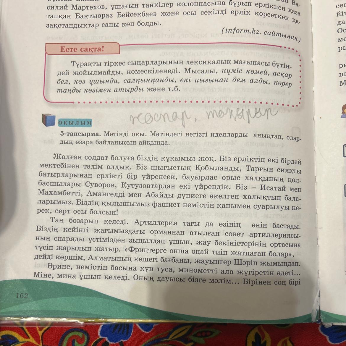 5-тапсырма. Мәтінді оқы. Мәтіндегі негізгі идеяларды анықтап, олар-