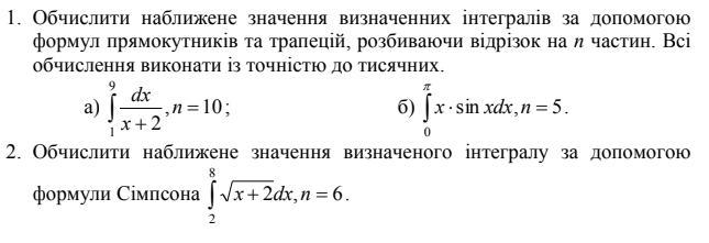 У завданні №1 (а,б) задані визначені інтеграли обчислити кожен за трьома формулами: лівих прямокутників, правих прямокутників та трапеції.