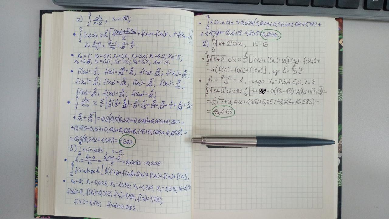 посмотрите решение интегралов только по формулам трапеций и Симпсона. Ответы отмечены цветным.