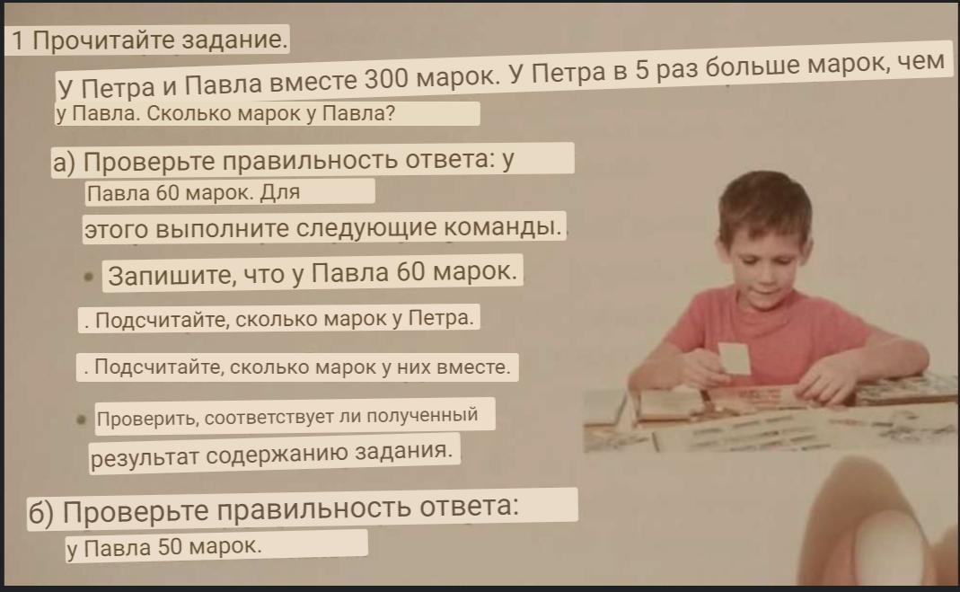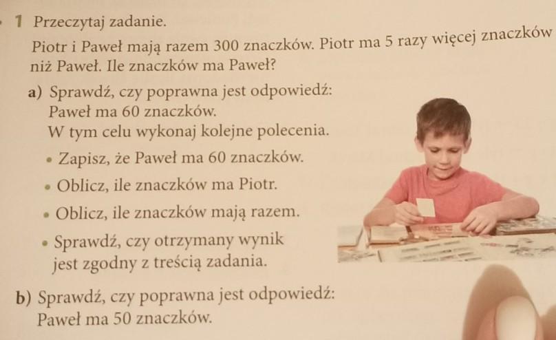 помоги те пожалуйста• 1 Przeczytaj zadanie. Piotr i Paweł mają razem 300 znaczków. Piotr ma 5 razy więcej znaczków niż Paweł. Ile znaczków ma Paweł? a) Sprawdź, czy poprawna jest odpowiedź: Paweł ma 60 znaczków. W tym celu wykonaj kolejne polecenia. . Zapisz, że Paweł ma 60 znaczków. • Oblicz, ile znaczków ma Piotr. Oblicz, ile znaczków mają razem. ● Sprawdź, czy otrzymany wynik jest zgodny z treścią zadania. b) Sprawdź, czy poprawna jest odpowiedź: Paweł ma 50 znaczków.