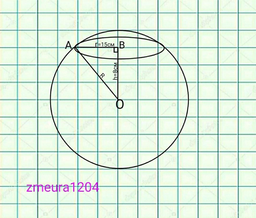 Переріз кулі площиною, що знаходиться на відстані 8 см від центра це круг радіуса 15 см. Знайти об'єм кулі