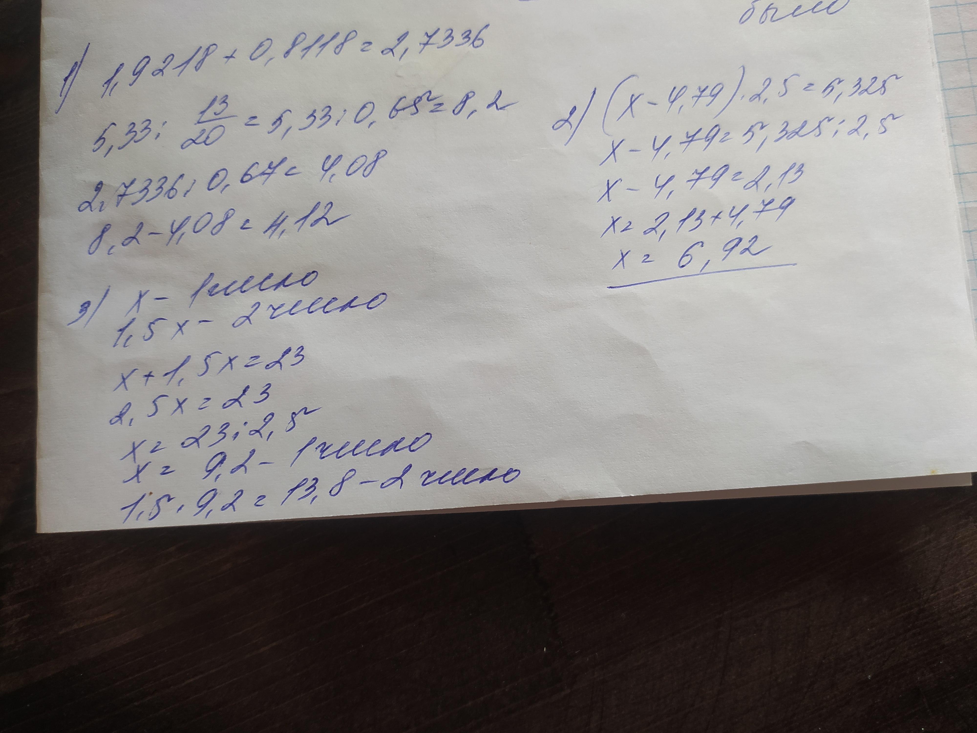 1. 5,33:13/20-(1,9218+0,8118):0,67=5,33:0,65-2,7336: 0,67=533:65-2,7336:0,67=8,2-2,7336:0,67=8,2-273,36:67=8,2-4,08=4,12.
